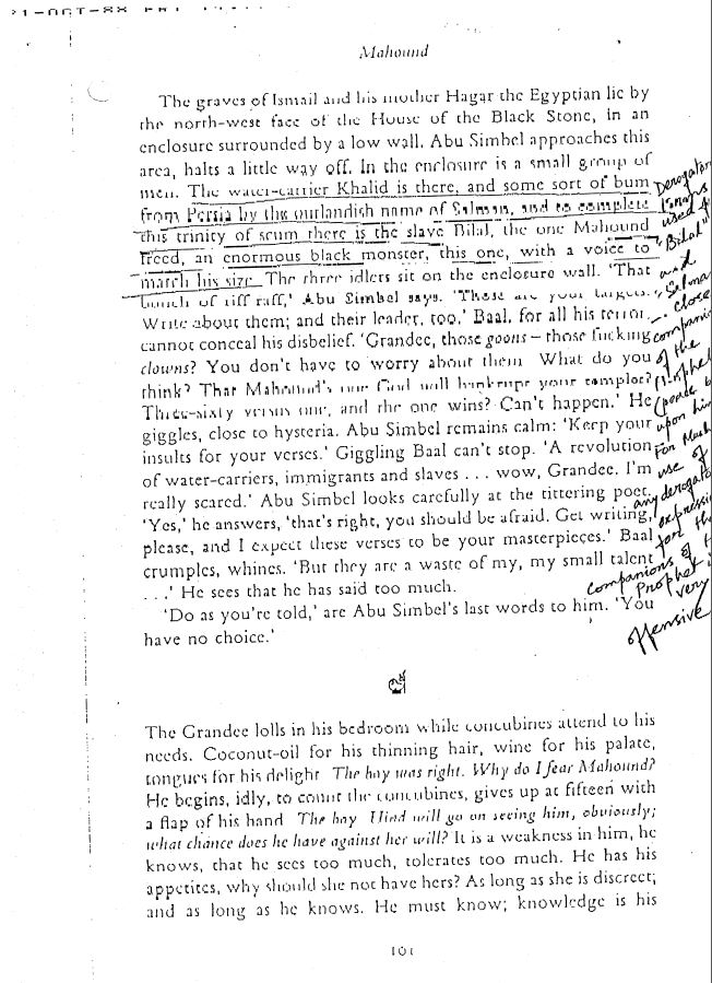 *On 26 October A. M. Bhorat sends a handwritten report, on one of the censors’ official forms, to the chief censor recommending that the novel be banned because it is ‘detrimental to the religious beliefs and convictions of the Muslim community.’ His ‘expert’s report’, as the censors call it, is, for the most part, a verbatim transcript of the Islamic Foundation’s general statement. Bohrat, a South African Muslim who works as a film censor, also appears to have submitted a copy of the novel at this point, which the chief censor returns on 2 November.
